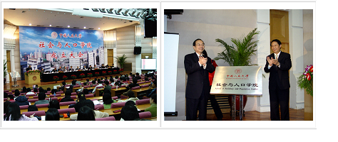 成立大会由社会与人口学院党委书记洪大用主持,校党委副书记张建民宣读了校党委关于组建社会与人口学院的决定和有关人事任免事项,蒋正华副委员长和我校党委书记程天权教授为学院铭牌揭幕。在主席台就座的还有中国老龄协会张志鑫副会长、中国人口学会田雪原常务副会长、中国社会科学院社会学研究所所长景天魁研究员、北京大学社会学系主任马戎教授、中国社会学会会长郑杭生教授、中国人民大学老年学研究所邬沧萍教授。全院师生近四百人参加了大会。