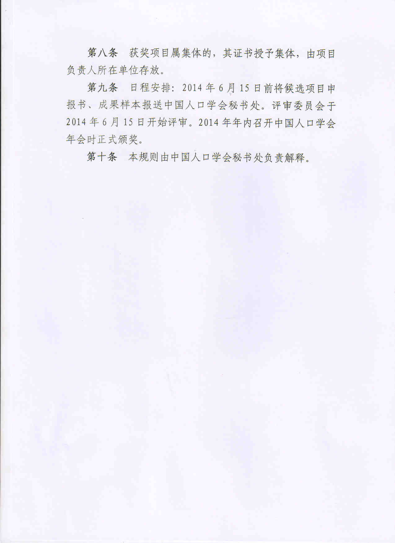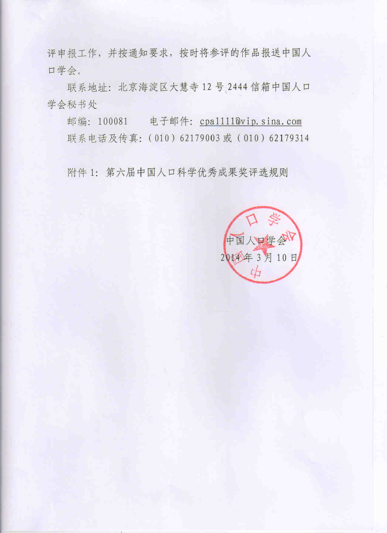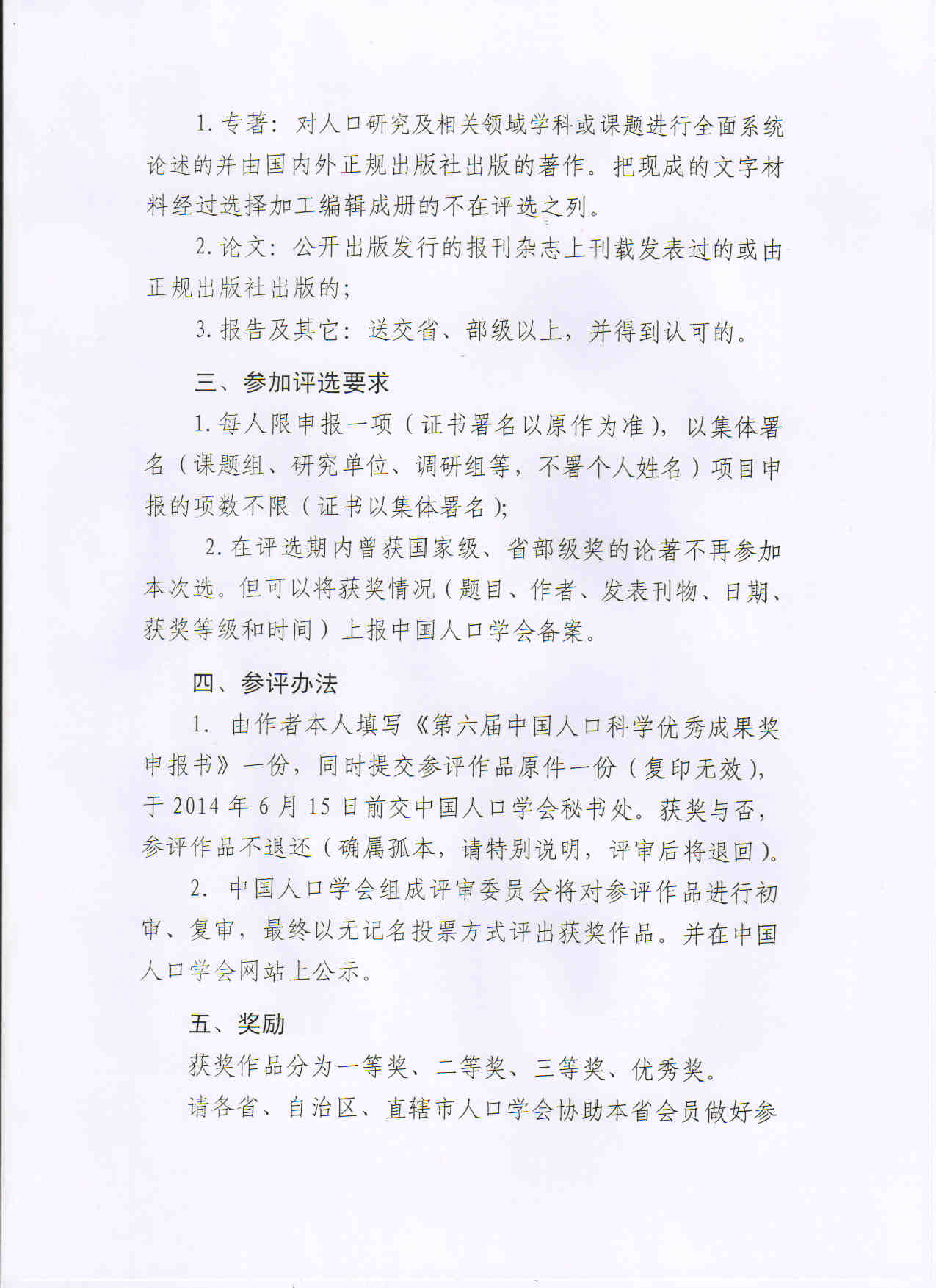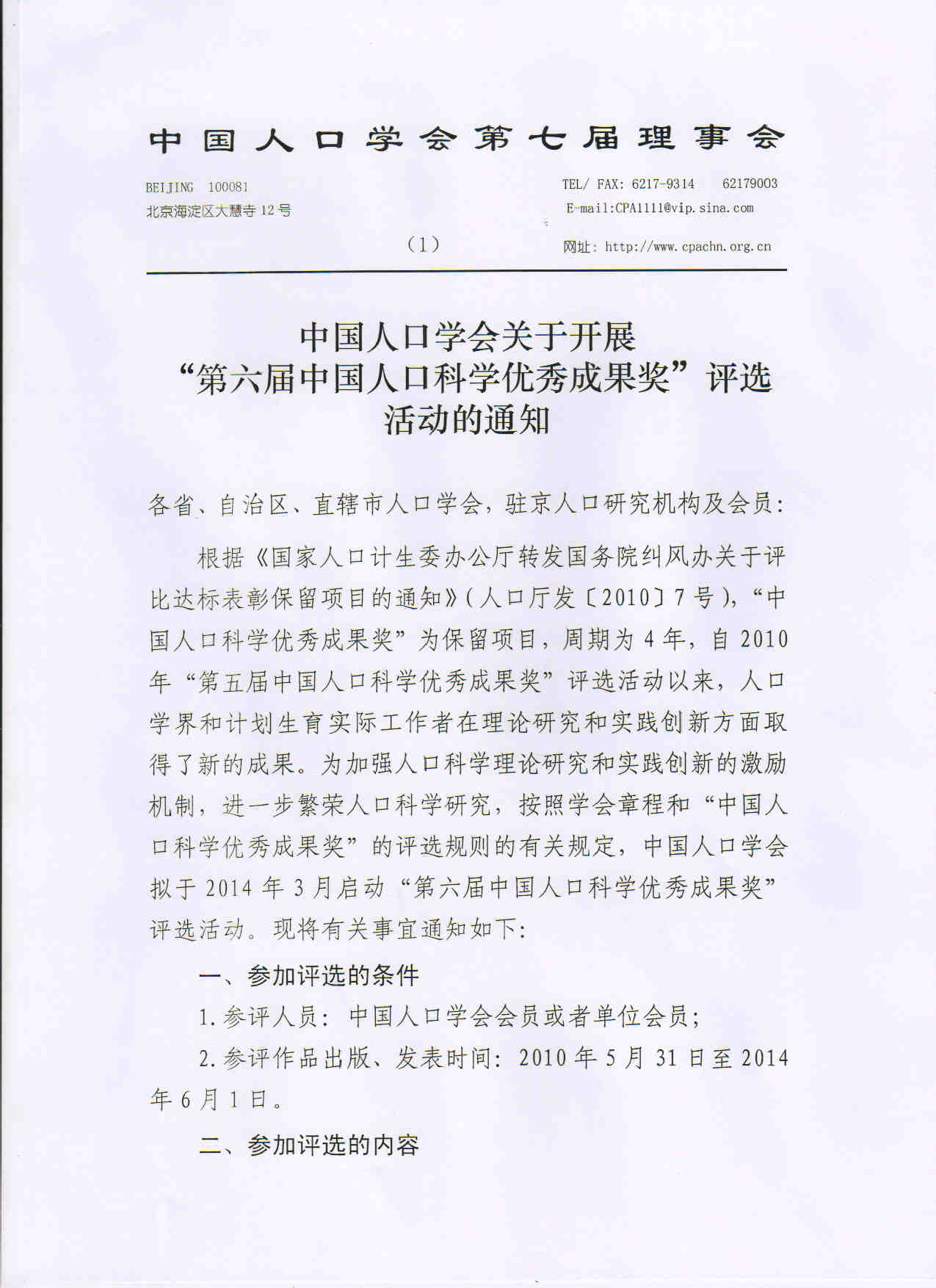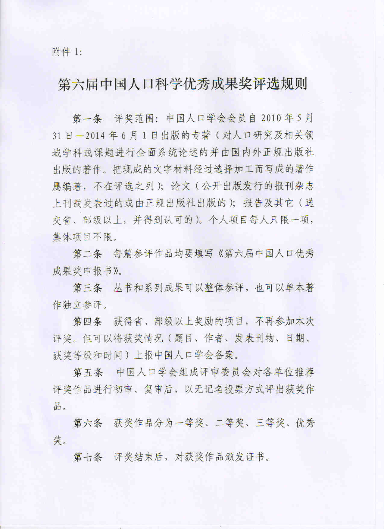 中国人口学会关于开展“第六届中国人口科学优秀成果奖”评选活动的通知